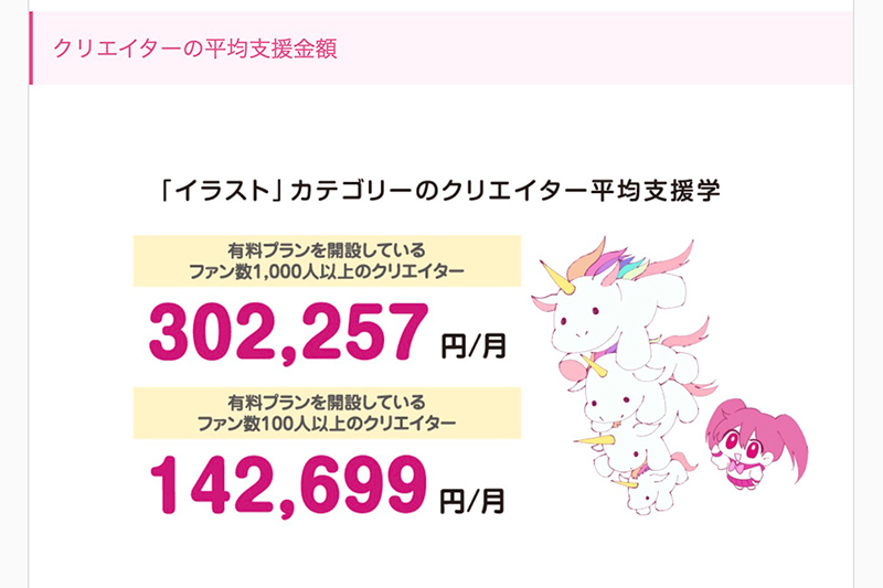 ファンティアの公式サイトによると、「イラスト」カテゴリーのクリエイター平均支援額は下記の通りです。