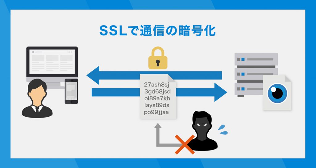 SSLとは、そのようなWebサイト上で情報を盗まれる被害からユーザや運営者を守るセキュリティ(暗号)システムのことです。最近ではWebサイトの「安全性」を維持するために、SSLを導入するのは当たり前になってきています。