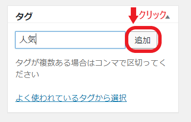 投稿画面の右側にある「タグ」から設定します。